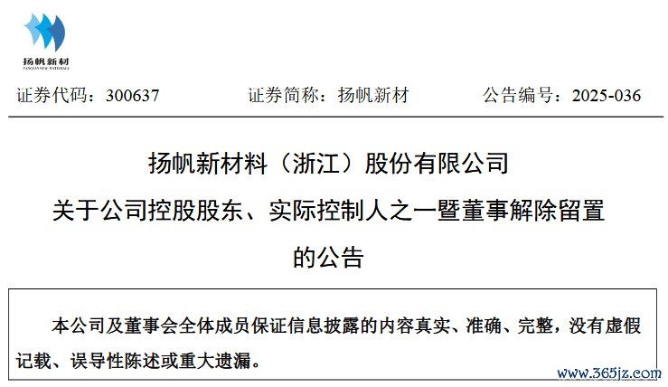 具体来看,扬帆新材公告称,公司于2025年8月25日披露了《关于公司控股股东、实际控制人之一暨董事被留置并立案的公告》。近日,扬帆新材收到浙江省丽水市庆元县监察委员会出具的《解除留置通知书》,庆元县监察委员会已解除对樊培仁的留置措施。目前,樊培仁已能正常履行公司董事的职责,公司生产经营情况正常。